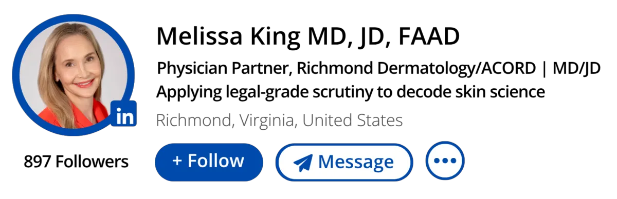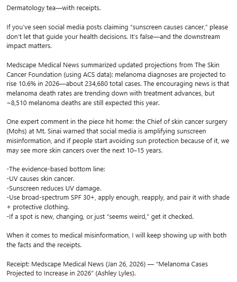 Skin health information moves fast, and most of it arrives without receipts. Across Instagram, TikTok, and Linkedin, I share evidence-based dermatology content grounded in twenty years of clinical practice — cutting through trends, examining the science, and dellvering verdicts you can actually use.